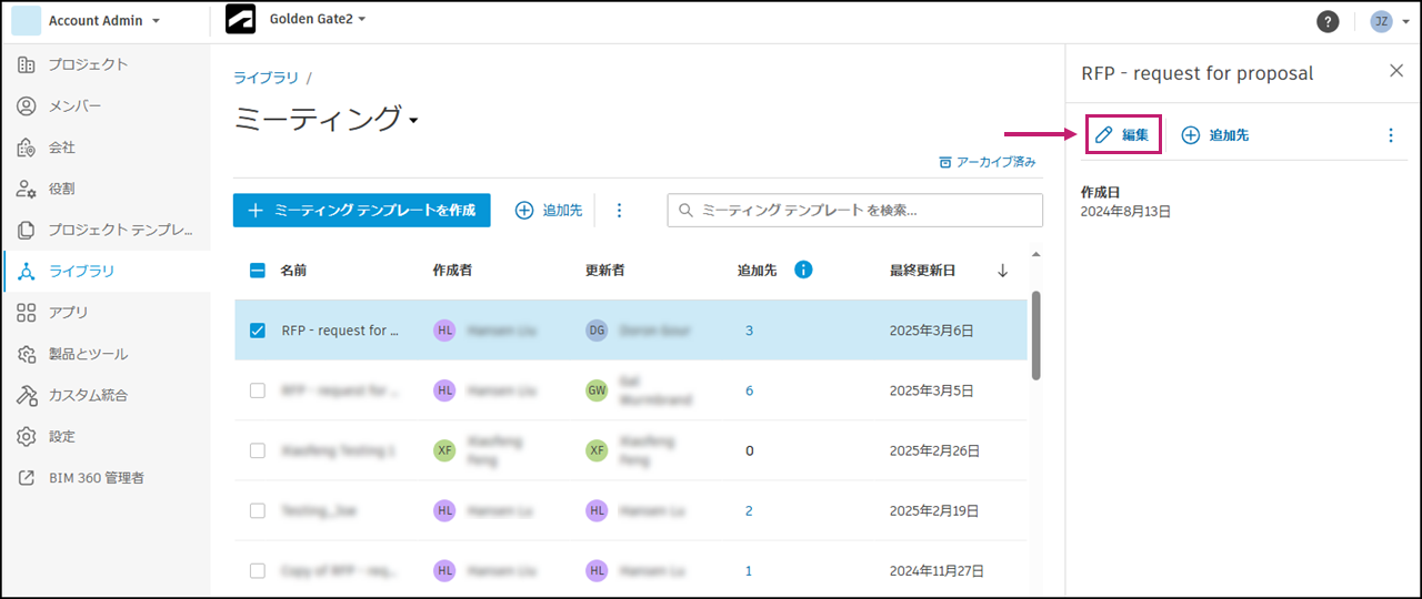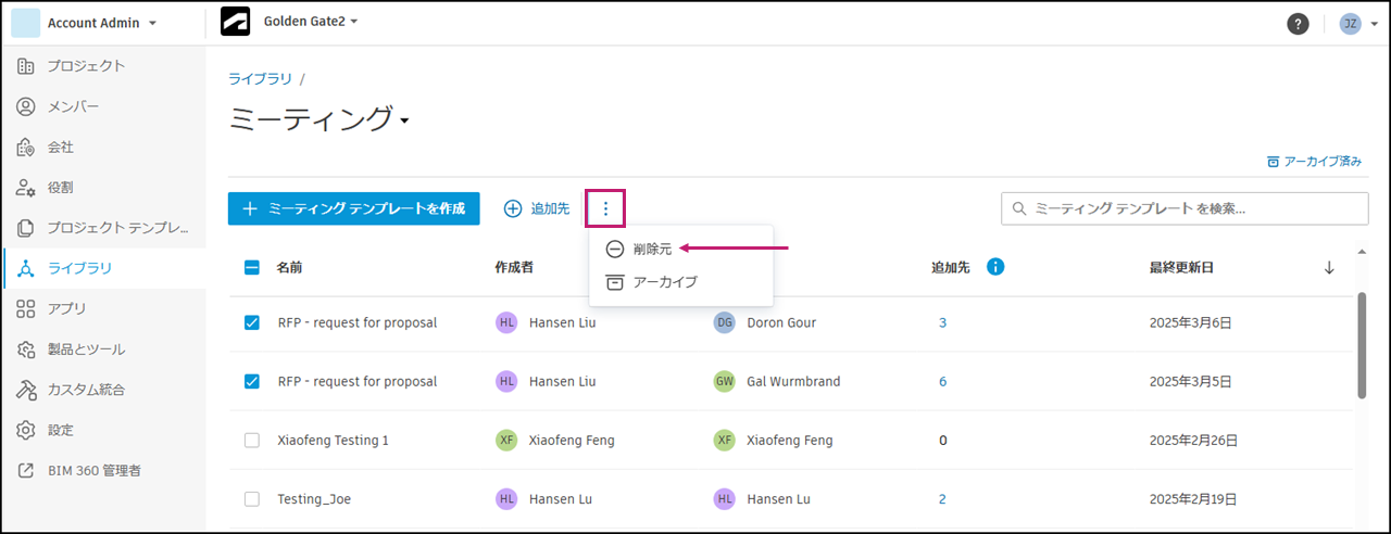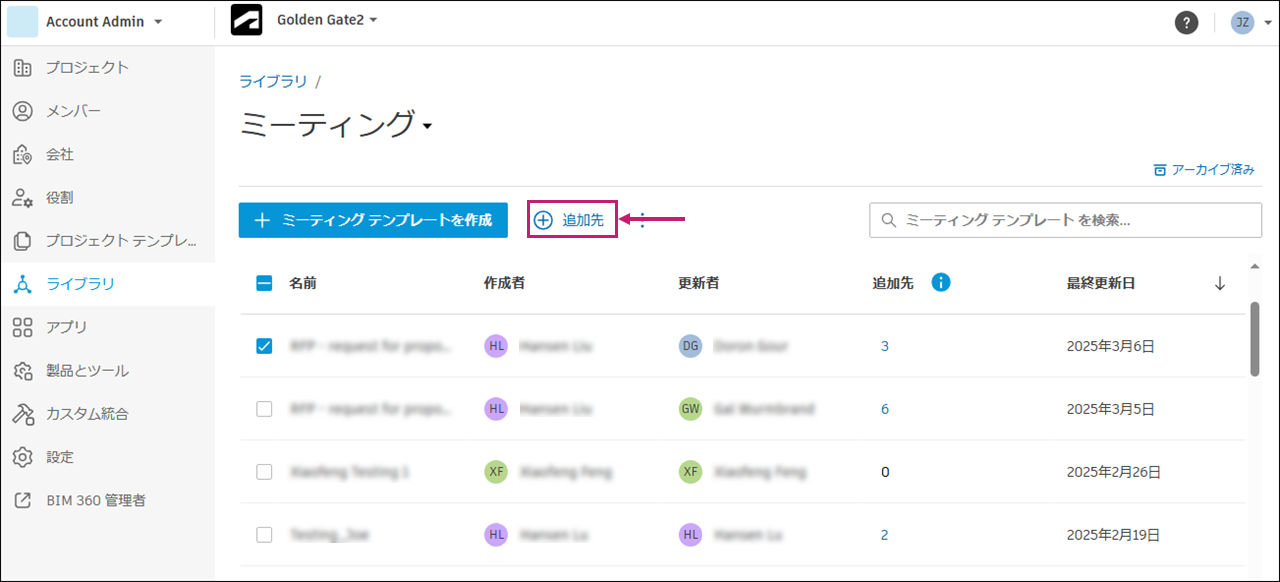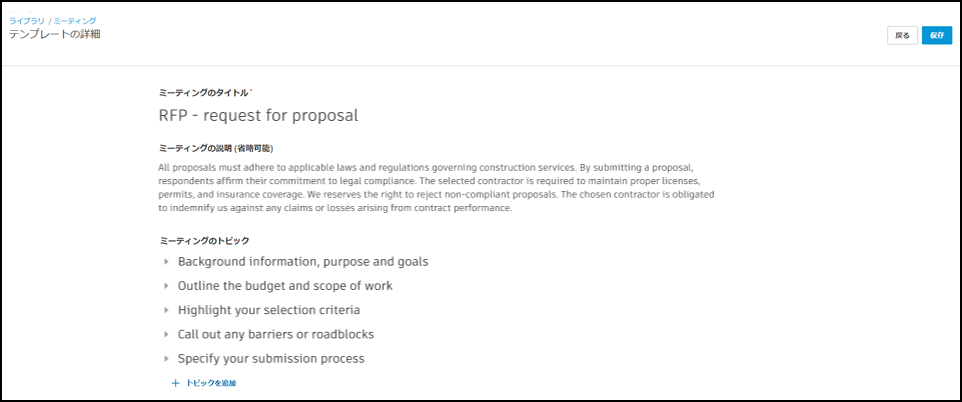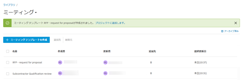 アカウント管理者は、自分のアカウントの[ライブラリ]でミーティング テンプレートを作成し、プロジェクトに追加できます。