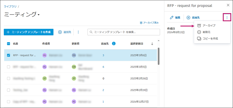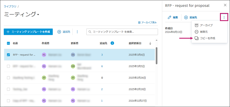 をクリックし、 [アーカイブ] を選択します。ミーティング テンプレートのコピーを作成すると、さまざまなプロジェクトや目的のテンプレートをすばやく作成できます。