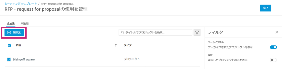 プロジェクトを選択したら、 [削除元] をクリックしてテンプレートを削除します。
