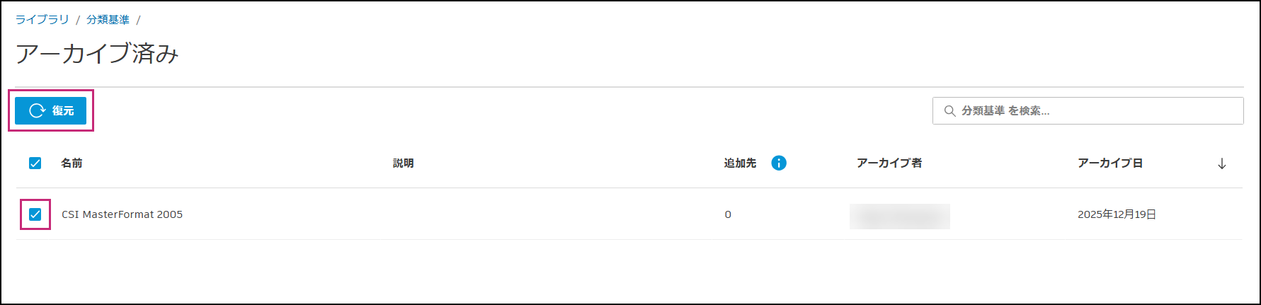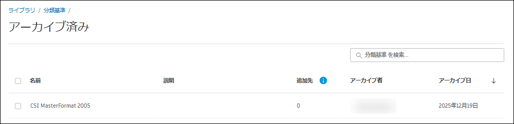 アーカイブされた分類構造体系を復元して分類基準リストに戻すと、新しいプロジェクトで使用できるようになります。アーカイブされた構造体系は、復元されない限り、プロジェクトに追加したり、プロジェクトから削除したりすることはできません。