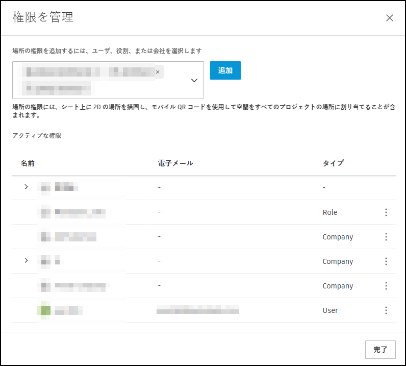 場所の管理者権限を持つすべてのユーザ、役割、会社が一覧表示されます。