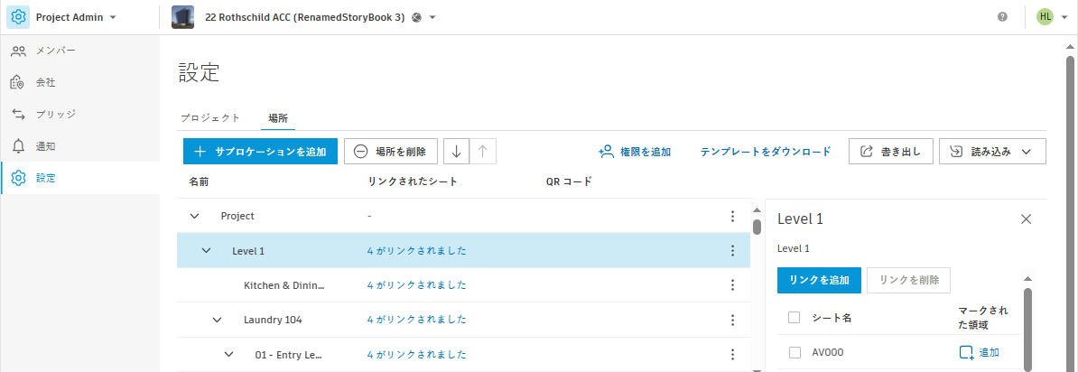 プロジェクト管理者は、プロジェクトの位置階層に作成された場所にシートをリンクすることができます。