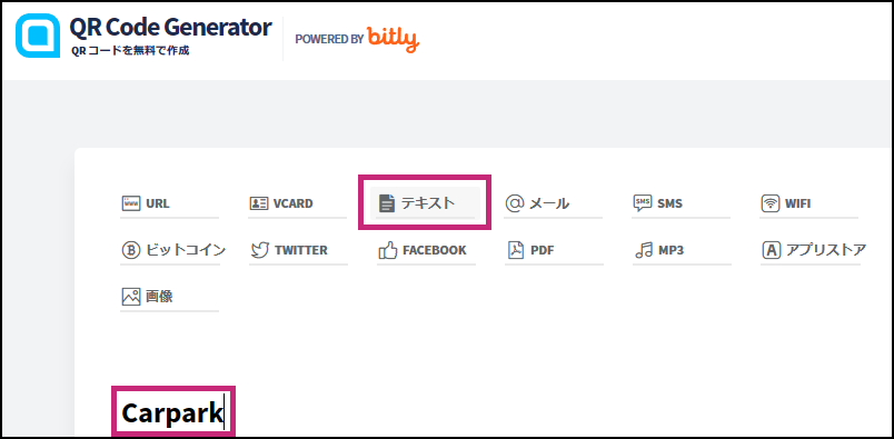 上記の例に従って、QR コードを場所 Car Park にリンクします。そのため、QR コード外部ツールで使用したテキスト CarPark を入力します。