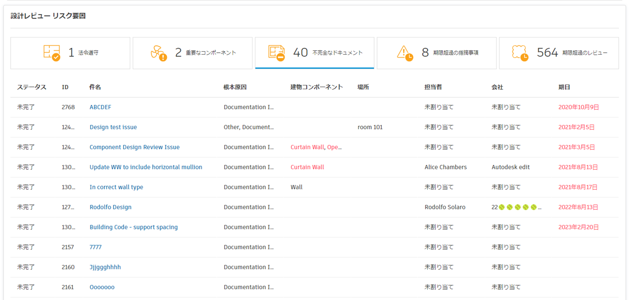 設計レビュー リスク要因に対するフィルタのいずれかをクリックして、拡張ビューを表示します。