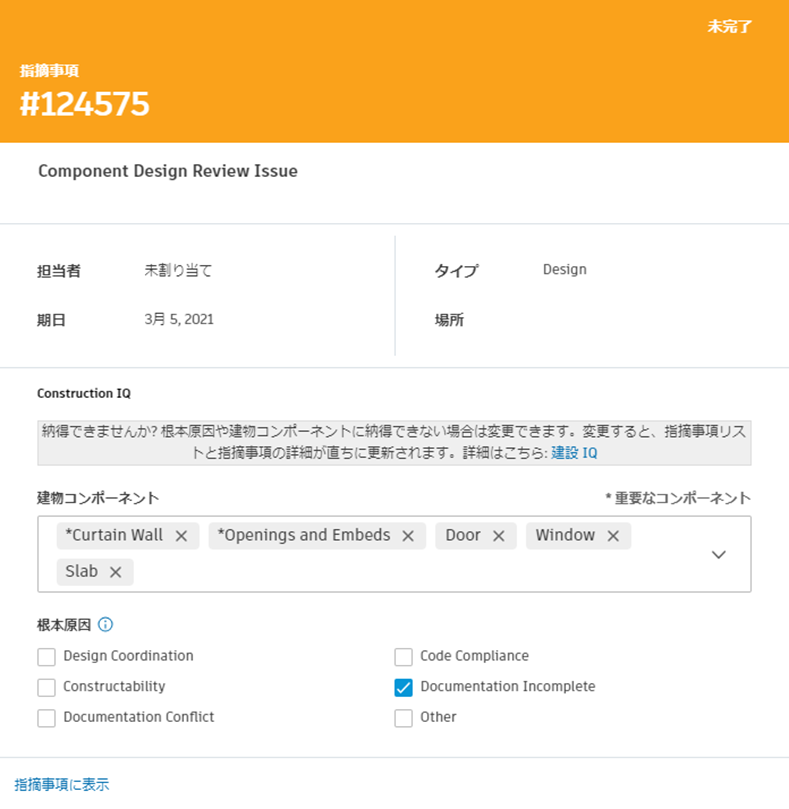 各リスク要因を使用して、根本原因と建築コンポーネントが Construction IQ によって予測されます。プロジェクト リーダーは、これら 2 つの属性を上書きすることができます。これを行うには、次の手順を実行します。