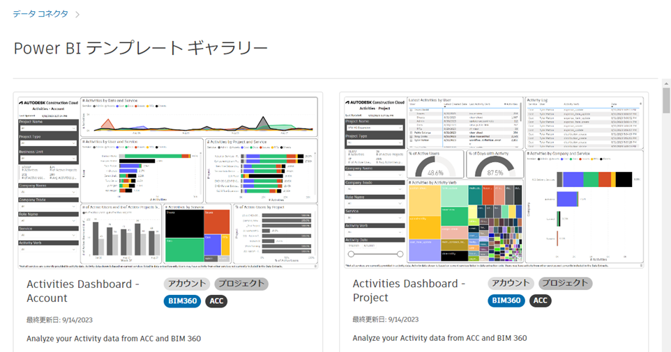 プロジェクト管理者および事業概況アクセス権を持つメンバーは、Data Connector で使用可能なテンプレートギャラリーから Power BI テンプレートを参照およびダウンロードできます。