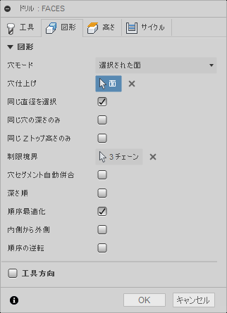 ドリル用に選択された面の数が含まれています。これはモデルに基づいたフィーチャ選択に使用されます。現在選択したすべての項目をオフにするには、X を使用します。
