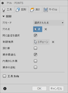 ドリル用に選択された点またはエッジ曲線の数が含まれています。これはジオメトリに基づいた穴の選択に使用します。現在選択したすべての項目をオフにするには、X を使用します。
