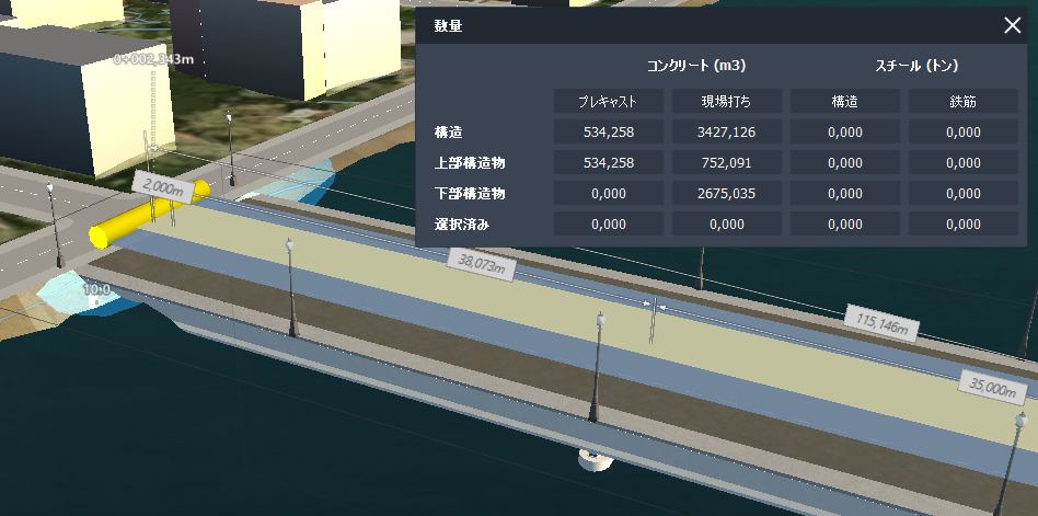 選択した橋または橋のコンポーネントで[数量]パネルを開き、それらの建設に必要なコンクリート マテリアルと鋼マテリアルを表示します。
