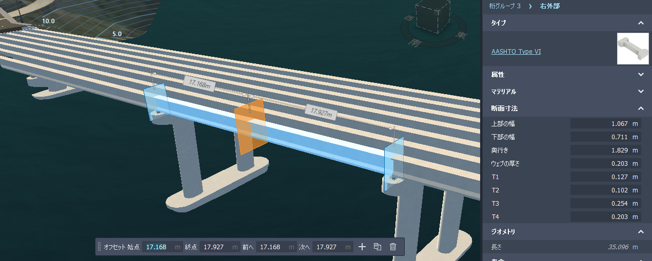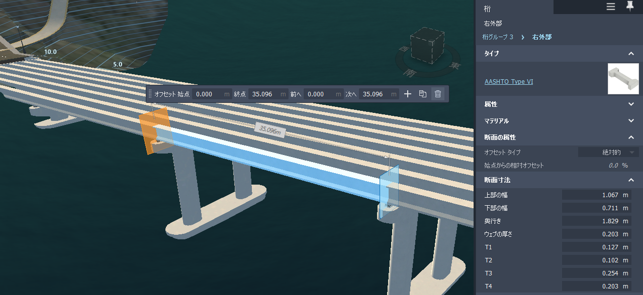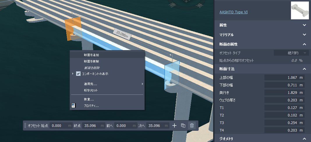断面を追加すると、桁を配置した場所の桁のジオメトリの寸法が補間されます。