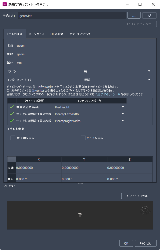 パラメトリック モデルの[パーツ サイズ]、[UI の外観]、または Revit カテゴリ マッピングを修正するには、「パラメトリック橋梁またはトンネル コンポーネントを修正するには」を参照してください。
