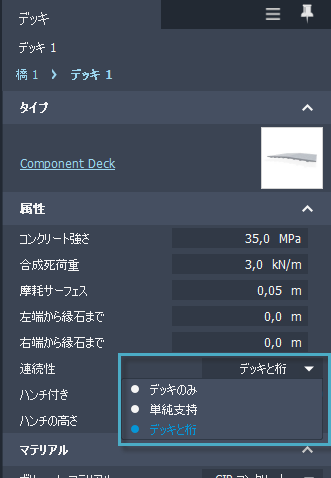 選択した橋梁のスタックの[デッキ]セクションでは、連続性の形式を選択できます。既定では、橋梁の連続性は[デッキと桁]に設定されており、これは完全に連続的な配置です。