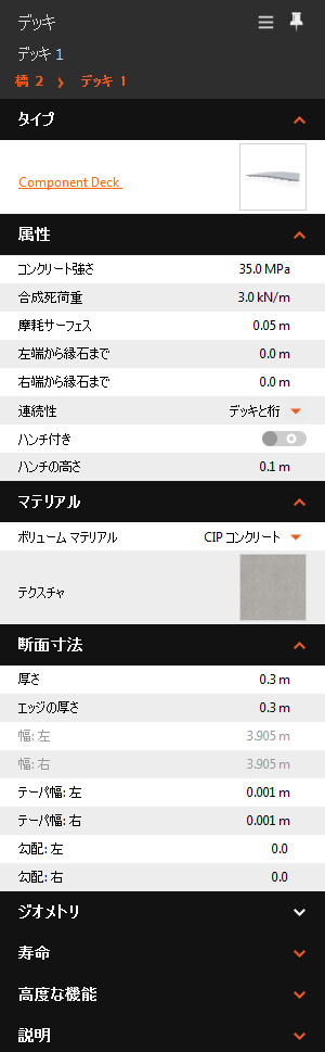 橋梁デッキの属性はスタックで確認および編集することができます。
