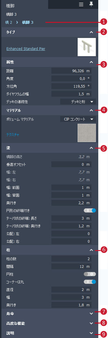 - [柱]: 橋脚コンポーネント スタイルに固有のプロパティ([キャップ]、[柱]など)を修正します。これらのオプションは、選択した橋脚コンポーネント スタイルによって異なります。