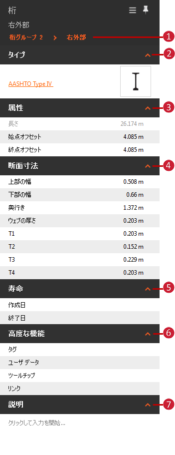 | | - 桁の名前は、橋梁タイプに応じて変わります。InfraWorks は、鋼桁橋梁とコンクリート桁橋梁をサポートしています。桁グループまたは桁の名前をクリックして、別の桁グループまたは桁を選択します。