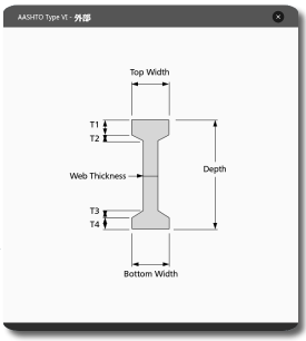 - 桁の断面の寸法(幅、深さ、ウェブの厚さ、T の値など)を修正します。また、桁の断面の追加または修正を行うこともできます。