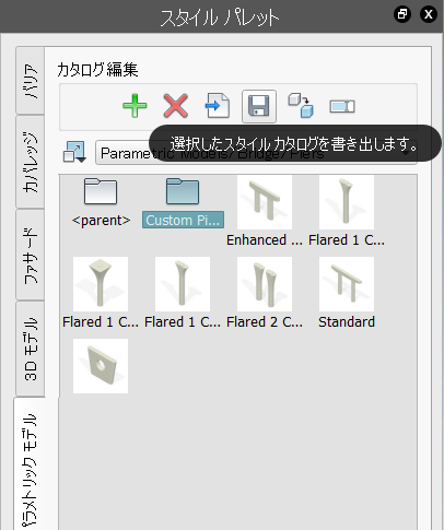 [スタイル パレット]の[パラメトリック モデル]タブからスタイル カタログを書き出し、他の InfraWorks ユーザとパラメトリック コンポーネントを共有することができます。
