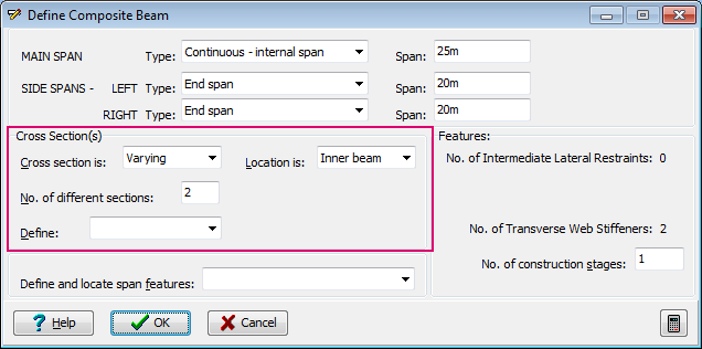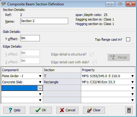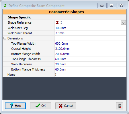 [コンポーネント]ドロップダウンで、定義されている鋼板桁 - I の任意のエントリを選択します。これにより、[複合梁コンポーネントを定義]ダイアログ ボックスが開きます。