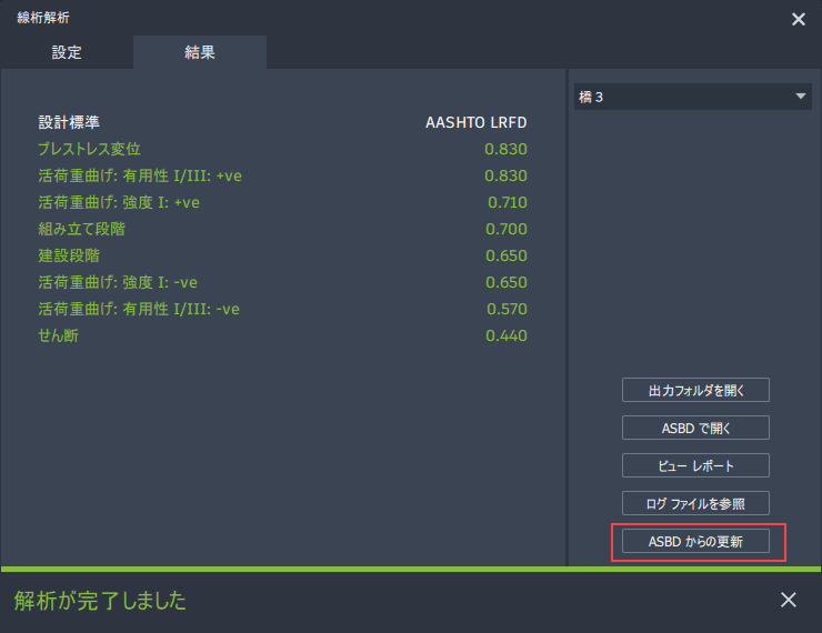 InfraWorks の解析ダイアログで[ASBD からの更新]をクリックします。