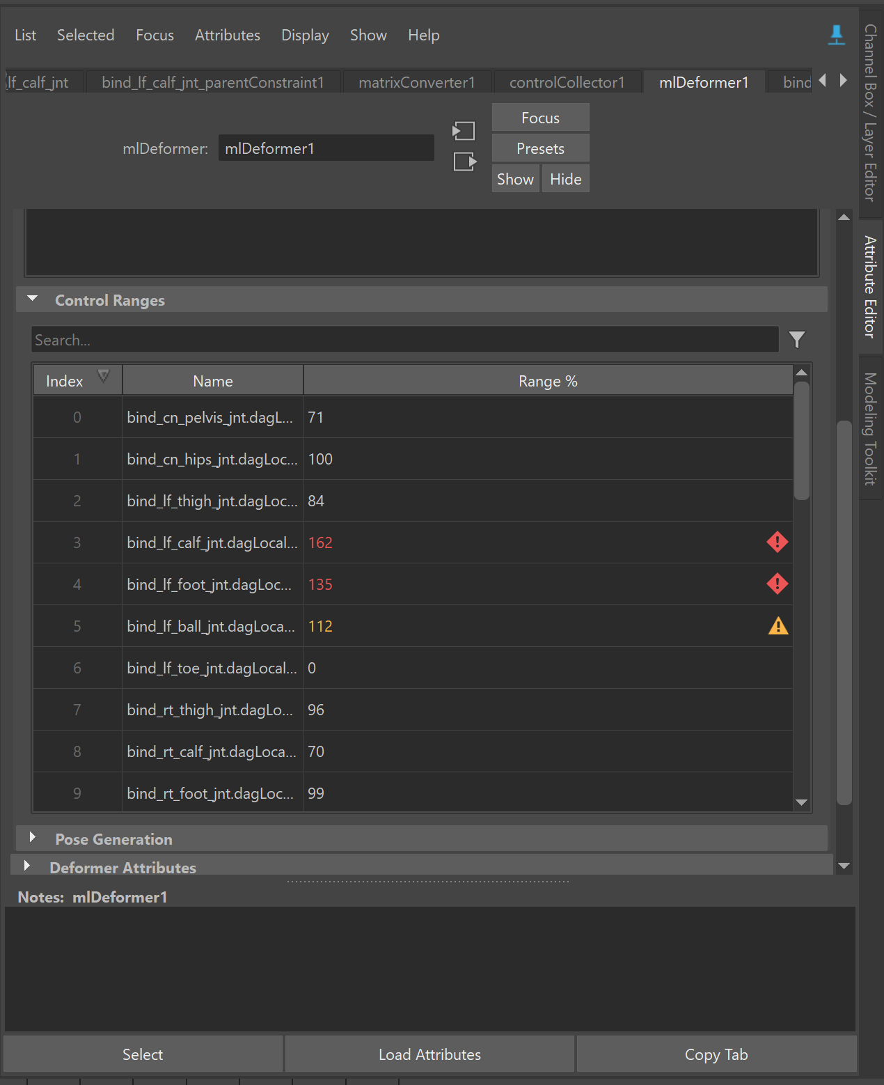 このテーブルで、現在のコントロール値と、すべてのアクティブなデフォメーション マネージャでトレーニングされた範囲が比較されます。コントロール値が元のトレーニング範囲の外側にある場合、範囲 % (Range %)の色が変わり、デフォメーションの結果が予測不能になることがあります。範囲が 100% 以下の場合は、コントロール値がトレーニングされた範囲内に収まっています。値が100% を超える値は、コントロールがトレーニングされた範囲の外側にあり、不適切な結果が生成される可能性があります。単一の ML デフォーマ ノードで複数のモデルがアクティブになっている場合(つまり、複数のジオメトリを操作している場合)、テーブルにはすべてのモデルで最も制限の厳しい範囲が使用されます。
