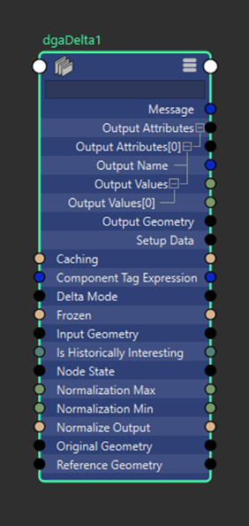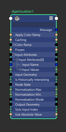 - 入力アトリビュート(Input Attributes): 可視化するダイナミック ジオメトリ アトリビュート データです。これを DGA 計算ノードの出力アトリビュートに接続します。複数のアトリビュートを接続して可視化できます。