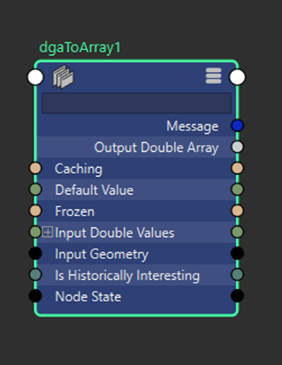 - DGA から配列(DGA To Array)ノードはダイナミック ジオメトリ アトリビュート データを配列アトリビュートに変換します。これにより、配列ベースの入力を必要とする他の Maya ノード、デフォーマ、またはレンダリング ワークフローで DGA データを使用できるようになります。
