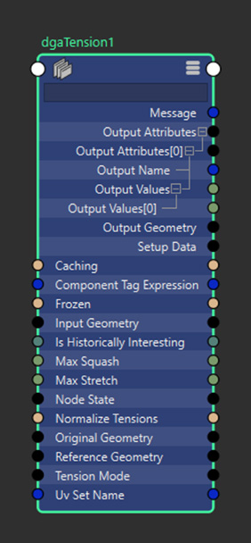 - DGA 張力ノードは、元のメッシュと変形後のメッシュを比較することで表面張力の値を計算します。このノードは、押し潰しと引き伸ばしを表す要素ごとのデータを出力し、可視化、解析、または下流のリギング ワークフローの推進に使用できます。