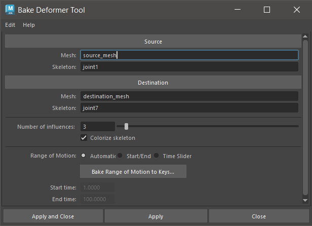 ベイク デフォーマ ツール(Bake Deformer Tool)を使用すると、任意のデフォーマからのデフォメーションを近似して、デフォーマのサポートが制限されているアプリケーションに複雑なリグを書き出せるようになります。この方法は、ウェイト値の「スマート」計算を使用してメッシュをスケルトンにバインドします。