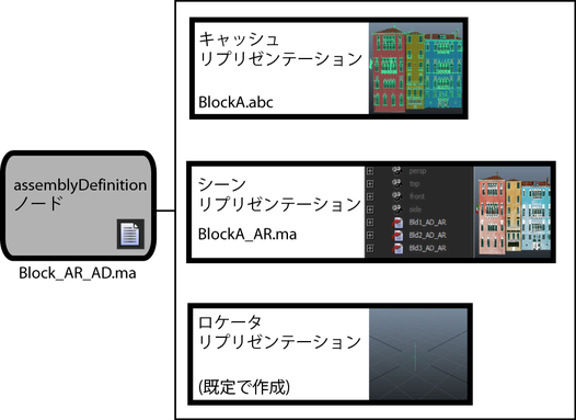 次の図に示されたシーン アセンブリ階層は、City_AR.ma assemblyReference ノードによって最上位で定義されています。この配置では、City_AR.ma assemblyReference ノードから、 Bld_AD.ma で定義されたシーン リプリゼンテーションに切り替えることができます。