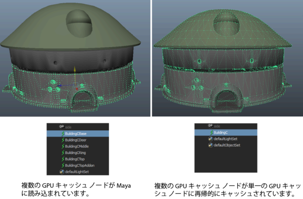 多数の GPU キャッシュをシーンに読み込み、その後すべてのオブジェクトを単一の GPU キャッシュ ファイルに書き出すことができます。このキャッシュ ワークフローを利用すると、データ セットが重い大サイズのシーンを処理する場合に発生するパフォーマンス問題の多くが解決されます。たとえば、グループ化されたジオメトリを選択し、各グループを GPU キャッシュに書き出すことができます。続いて、この GPU キャッシュを読み込んでシーンをアセンブリし、シーン全体を単一の GPU キャッシュ ファイルに書き出すことができます。