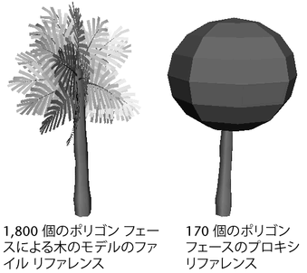 シーンには木のモデルを含むシーンへのファイル リファレンスがあります。参照する木は単純なプロキシ リファレンスで代用されます。