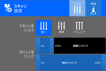 [スキャンをフィルタ]設定は、読み込まれたスキャン ファイルからどの程度積極的に浮遊ポイントを除外するかを決定します。