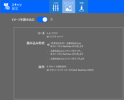 (スキャンごとの複数のパノラマ イメージのみ)点群によるスキャンの予測数と、作成された RealView の数を表示する読み取り専用の情報です。