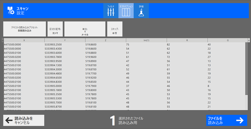 単位: 読み込むテキスト ファイルの計測単位を指定します。サポートされている 6 つの単位は、ミリメートル、センチメートル、メートル、国際インチ、国際フィート、米国測量フィートです。