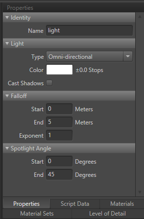 - End: スポットライトが終了する角度を示すために使用します。例: Start = 0、End = 45 である場合、45 度のスポットライトになります。