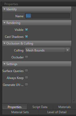 - Always Keep: このチェックボックスをオンにすると、このオブジェクトはシーンに影響を与えない場合でも、メッシュのリストに含まれます。非表示のメッシュをスクリプトからアクセスできるようにするために使用します。