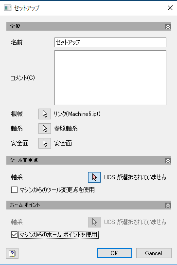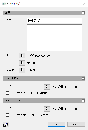 マシン、軸系、安全面が[セットアップ]ダイアログ ボックスに表示されるようになりました。