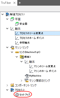 セットアップには、パーツを製造するために必要なすべての設定と要素が含まれています。セットアップは、TruFiber の製造プロセスの一部として作成します。セットアップには、マシン、軸系、平面が含まれています。セットアップの作成を開始する前に、これらすべての準備が整っている必要があります。セットアップを作成すると、プログラムとツールパスを作成できるようになります。