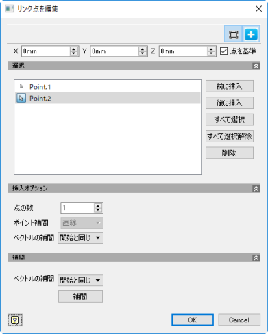 - [ベクトルの補間]: 最初の点(開始と同じ)、最後の点(終点と同じ)などの挿入した点に方向を合わせるか、最初および最後の点に基づいて方向を補間するかを選択します。