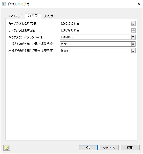現在のドキュメントの既定の許容差とブレンド半径を設定するには、このタブを使用します。 また、[方法]ダイアログ ボックスで[ロゼットのチェック]が有効になっている場合の許容差を設定することもできます。