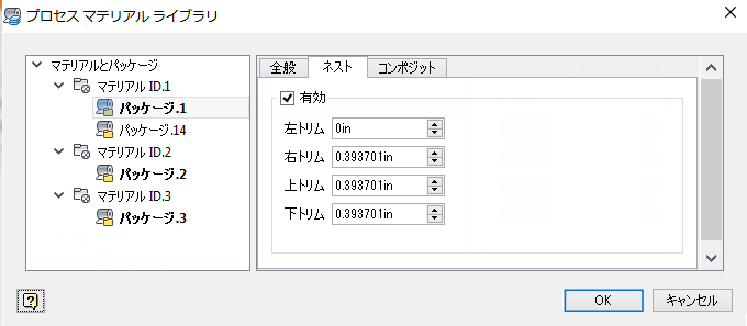 パッケージの既定のネスト値を設定します。これらは、後で Autodesk Nesting Utility を使用してネストを作成するときに使用し、変更することができます。