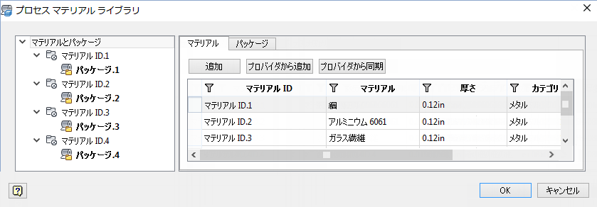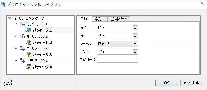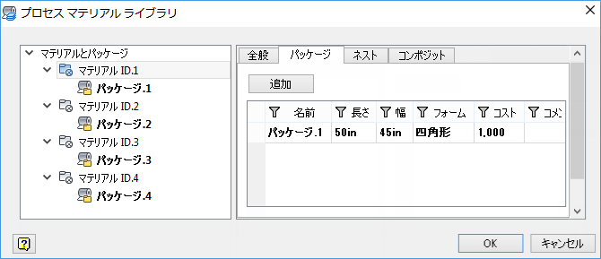 パッケージは、原材料のサイズと形式を定義します。Autodesk Nesting Utility などのアプリケーションでマテリアルを使用するときに、マテリアルのパッケージ タイプのリストから選択する必要があります。このリストは、[プロセス マテリアル ライブラリ]ダイアログ ボックスで作成します。パッケージを作成する前に、ドキュメントに少なくとも 1 つのマテリアルが定義されている必要があります。