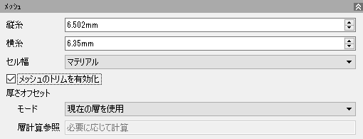 [方法]ダイアログ ボックスの[メッシュ]セクションで設定する値は、コンポジット マテリアルの解析グリッド(サーフェス メッシュ)を定義します。解析が正確になるように、メッシュの値を慎重に設定します。[繊維のドレープ]伝播モードを使用する場合、[縦糸]設定のみを使用できます。