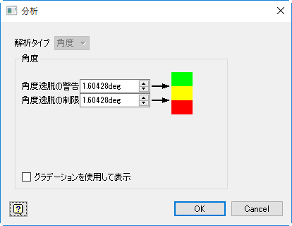 これを選択すると、特定の位置でのメッシュの値に応じてグラデーションが使用されます。たとえば、値が[角度逸脱の警告]より大きく[角度逸脱の制限]より小さい場合、それらの制限やカラーに対する実際の値の相対的な位置に基づいて、値がグラデーションとして表示されます。