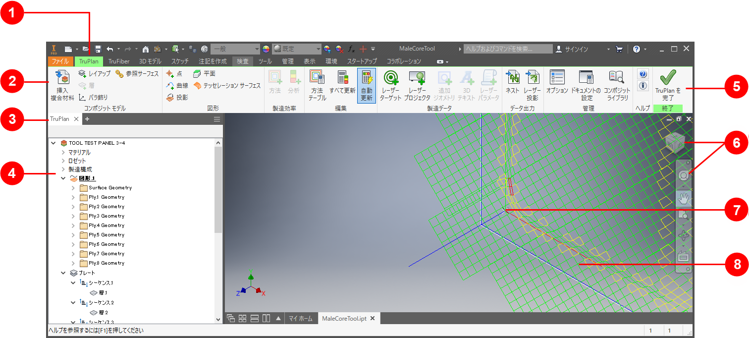 - TruPlan リボン。コンポジットを開く方法や挿入する方法、レイアップや層などのオブジェクトを作成する方法、点とカーブを追加および投影する方法、サーフェスをテッセレーションする方法、ネストとレーザー投影出力を作成する方法については、ヘルプを参照してください。