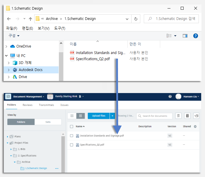 연결된 드라이브에서 데스크톱 제품을 사용하고 파일을 편집하면 문서 관리 모듈에서 해당 사항이 자동으로 업데이트됩니다. Desktop Connector에 있는 Revit의 모형을 링크하면 BIM 360에 있는 모든 사용자에 대해 해당 모형이 링크됩니다.