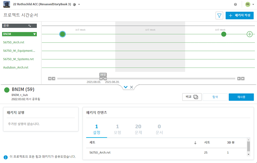 패키지에서 새로 공유된 항목은 집계된 프로젝트 모형의 컨텍스트로 뷰어에 표시됩니다. 패널의 옵션을 사용하여 팀, 단계 및 레벨별로 필터링하거나 패키지의 세트, 모형 및 문서 리스트를 볼 수 있습니다. 자세한 내용은 집계된 프로젝트 모형을 참고하십시오.