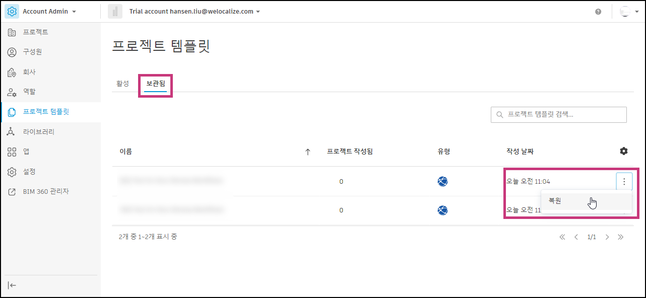 보관된 템플릿은 프로젝트 템플릿 도구의 보관됨 탭에 있습니다.
