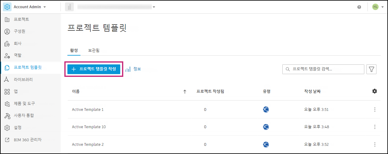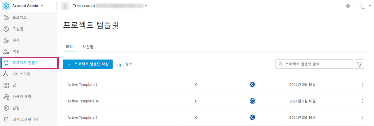 Account Admin의 프로젝트 템플릿 도구에서 활성 및 보관된 프로젝트 템플릿을 찾을 수 있습니다.