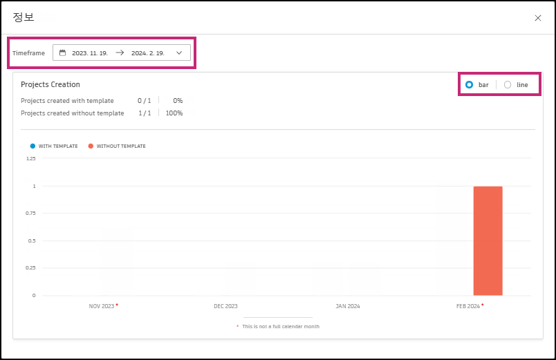 대시보드에서 템플릿에서 생성된 계정의 프로젝트 수를 확인하고 표시된 기간을 조정하거나 막대 또는 선 그래프 중에서 선택할 수 있습니다.